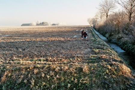 Berijpte akkers met op de achtergrond de boerderij van de familie Schuiringa. Foto genomen vanaf de Noorderweg. Rechts de noordkant van het terrein van de nieuwe Dörpsstee. Enkele kinderen vermaken zich met het broze ijs op de akkerplassen. Open landschap, BEDREIGD als rondwegplan 5B doorgaat, zoals Gedeputeerde Staten het op dit moment voorstellen. Veel geestdrift breng ik er niet voor op… (Al geef ik toe dat het voor mij acceptabeler is dan de forse ingreep aan Noordhorns zuidkant).
