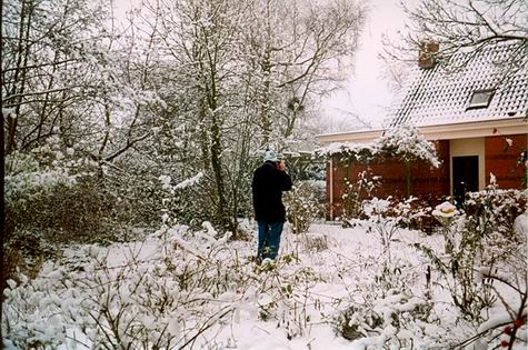 Even iets anders. Soms vang je gedachtenloos iets op, van de radio bijvoorbeeld: “Sneeuw in Bagdad – voor het eerst in járen – teken van hoop”. Nou, misschien moeten we hier dan ook maar gauw eens een fiks pak sneeuw hebben….. Ter voorbereiding alvast bijgaande foto: de fotograaf gefotografeerd, de knipper geknipt, de kieker gekiekt….. Plaats: het bewitte groen bij het pad van de Verlengde Oosterweg naar de Nieuwstraat, zicht op de noordkant van het huis, waar vroeger de kwekersfamilie Hummel woonde, daarna o.a. de families Loos en Hop en nu, kom, hoe is de naam al weer… Winter 2000-2001.