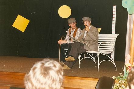 Nog een tweetal in een sketch, boerentweetal Karin Pot (stagiaire) en JB, ook levensecht. Waarover het ging? Ik moet toch maar eens op zoek naar de teksten van toen, op dit punt laat mijn geheugen me in de steek. Karin vormde samen met Riny Doorenbos een initiatiefrijk en motiverend duo, dat enthousiast meedeed. (Bovendien speelde ze op redelijk hoog niveau korfbal bij Sparta in Zevenhuizen). Vertrok later met partner Jaap Harkema naar Friesland (Bolsward?), korfballand. En verder?