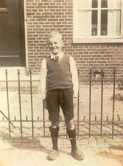 Een vriendelijk lachende jongen, op klompen, met kniekousen, lange korte broek, vest, gestrikte das, blonde haren netjes gekamd… Fotogeniek op onbekende plaats in Noordhorn. Vermoedelijk begin jaren veertig. Afgebeeld is Willy Kamstra, officiële achternaam Sijtsma. Willy is in 1932 geboren, groeide op in het gezin van zijn oma Kamstra aan de Achterweg (= Oosterweg). De meeste mensen in het dorp wisten dat er “iets aan de hand was”. Er werd niet of nauwelijks over gesproken, zeker niet met kinderen. Voor velen was oma Kamstra Willy’s moeder. Zijn “broers” Gerrit en Jan waren in werkelijkheid zijn ooms. Al was Gerrit maar 3½ jaar ouder dan Willy.