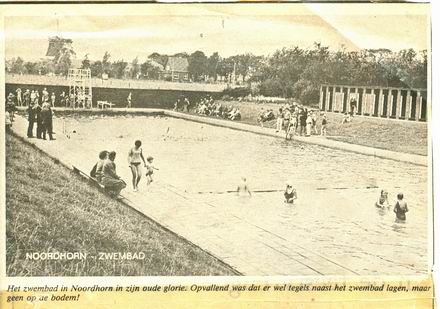 De perikelen die in Zuidhorn leiden tot de neergang van het overdekte bad “De Waterborgh“, als de visie van B.en W. tenminste door de gemeenteraad wordt gevolgd, vestigen meteen weer de aandacht op het openluchtbad dat Noordhorn ooit “bezat”. In augustus 1930 werd het bad op de toenmalige grens van Zuid- en Noordhorn (eigenlijk lag het bad nog in Zuidhorn, aan de zuidkant van de Noordhorner Tocht) geopend door de rijzige burgemeester De Vries. Veertig jaar later was het over en uit. Het bad kon onvoldoende worden gemoderniseerd en de bereidheid daartoe was ook niet groot. Begin jaren zeventig kreeg het grootdorp zelf zijn openluchtbad “De Dobbe” na een geslaagde gezamenlijke actie. Helaas was dit bad geen lang leven beschoren… Hoewel Noordhorn zich toén bijzonder coöperatief gedroeg, vond menigeen het jammer dat het zwembad bij eigen dorp verdween. Voortaan liet oud-politieman Van der Molen er zijn pony’s draven. Nu is het terrein zoals eerder gezegd eigendom van de familie Kooi en heeft Piet Bos het in bruikleen. Toch is er af en toe heimwee naar het oude bad, de route (niet via de Badweg) langs het kanaal en het paadje naast het huis van Hiemstra, de gemoedelijkheid, het wat fanatiekere optreden van meester Wiechers, met fluit en al, de kikkers en de vissen, voorbij, voorbij…..