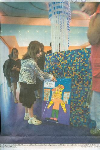 Kinderen van OBS De Molshoop Noordhorn zijn aan een project begonnen: “Doe lief, maak de wereld mooier!” Stimulerend leerkracht juf Iris van der Meer begeleidt de kinderen bij het maken van schilderijen en posters. Kinderkunst die wordt weggegeven, een cadeautje voor een ander. Zo zijn er twee kunstwerken naar het Groninger Museum gebracht. Beide werken bleken snel een belangstellende “meenemer” te vinden. Een van de twee gaat bijvoorbeeld naar een klaslokaal van de W.A.van Lieflandschool in Groningen. (Bron: Dagblad van het Noorden, Stad en regio, 11 juni 2008)