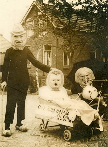 Achter het middelste masker gaat Wibo Sijtsma schuil, toen nog heel jong van jaren. Maar wie zijn die twee anderen? De foto is gemaakt aan de Oosterweg nabij de nieuwe school.