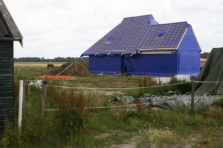 Vervolgens gaat het hard. Je draait je om, fietst er nog wel eens langs, ziet dat het huis hoogte krijgt. Vandaag aan het eind van de middag nieuwsgierigheid bevredigd. Verrassend, er staat een keurig verpakt nieuw huis!