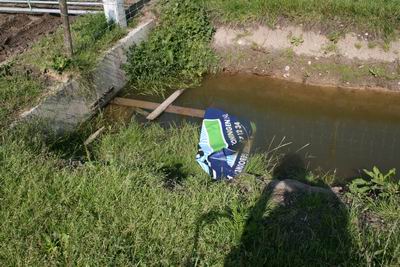 Het reclamezeildoek van de aannemer uit Drachten, het zogenaamde ‘wapperding‘, is losgeraakt en in de sloot beland. Niet voor de eerste keer…. Er zijn ergere noodlandingen, maar toch staat het wat slordig: een bouwbedrijf dat zich presenteert op de bodem van een aangrenzende sloot….