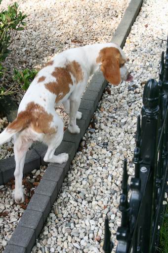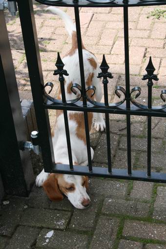 Ooooo, zááálig…..! Maar ja, de andere baas met andere hond wandelt weer verder, op is op. ‘Verd…. dat ik nou hier achter het hek moet blijven, ik wil er achteraan, misschien krijg ik dan nog wat….’