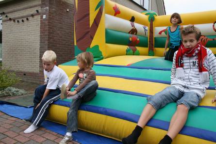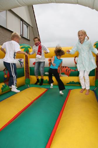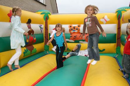 De straat die een week lang tot junglegebied is verklaard, maar merkwaardig genoeg desondanks gezellig in het kwadraat is. Vooral ’s avonds natuurlijk. In die gezelligheid is een belangrijke plaats voor de kinderen, die enkele dagen intensief gebruik konden maken van een springkussen. (Wellicht jungle-geïnspireerd? In opleiding voor Tarzanrollen, of die van Jane?). Geweldig initiatief!