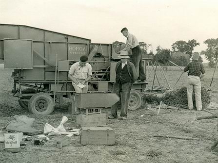 Op de foto zullen dus waarschijnlijk aanwezig zijn: een landeigenaar, een persoon die de dorsmachine instelt en bedient, en een persoon die het product beoordeelt.