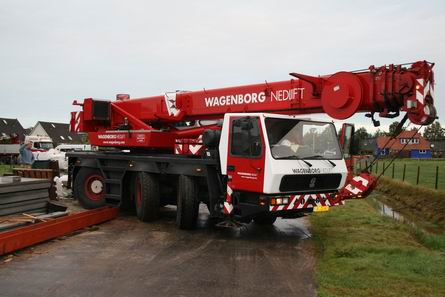 Daar staat ie dan, de Wagenborgkraan. Nou ja, bijna..... Het duurt vanzelfsprekend even, voordat de benodigde stabiliteit is verkregen. Dan kan er ook veel (til)werk worden verricht, waarbij computertechniek een hoofdrol speelt. Duur? Ga die klussen maar eens handmatig doen....