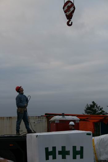 Voordat de vloer van de eerste etage kan worden geplaatst, moet er eerst nog heel wat materiaal uit de bouwput worden getild. Fluitje van een cent, nou ja, een paar centen....