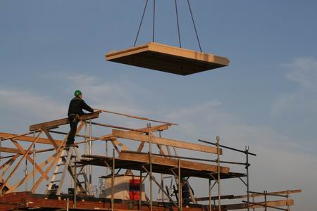 Machtig mooi dat gecomputeriseerd werken vanuit een hoge kraan. Snelheid troef, precisie idem dito! En zo komen de dakdelen, waar ze moeten zijn, uiterst nauwkeurig!