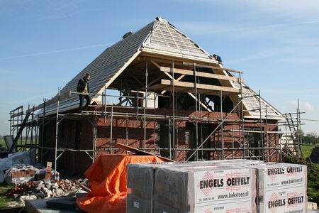Zo ziet het huis er dan uit, in de loop van de middag. De kraan is dan al weg, voor de timmerlui is er nog voldoende te doen....