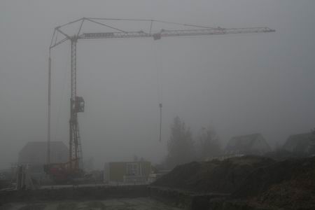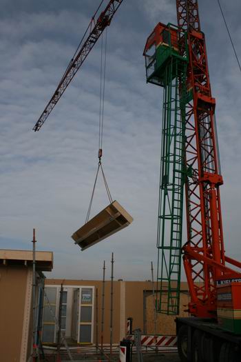 In de ochtendmist beheerst een indrukwekkende kraan de situatie bij kavel Meidoornstraat 18. Doelmatig worden de diverse delen tot een prachtig huis samengevoegd.