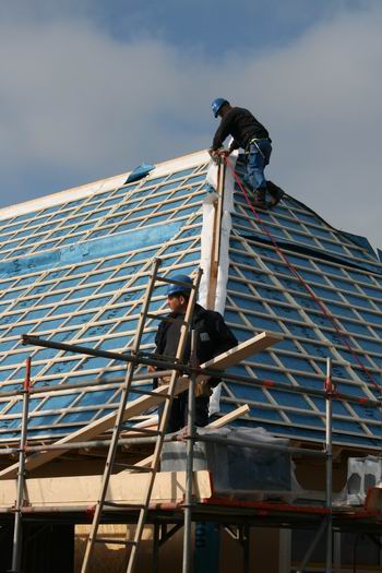 Houtskeletbouw! Het is en het blijft spectaculair: het binnen twee dagen op een gereedliggende vloer zien ontstaan van een complete woning. De ontspannen, kundig werkende VDM-vaklui zetten de diverse delen haast achteloos in elkaar. Ook het dak zit erop, Henk Bakkers droomhuis (Meidoornstraat 18) is lijfelijk aanwezig. De dakpannen? die worden volgende week gelegd. De muren worden over enkele weken opgemetseld. Dan kan het binnenwerk beginnen, nog het meest tijdrovend.