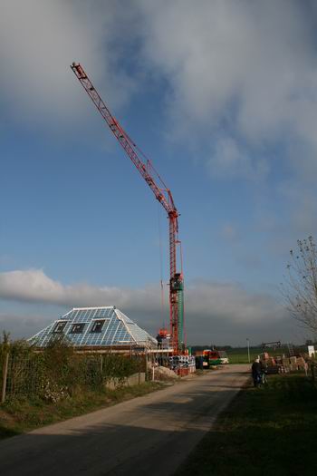 Sfeerbeeld vanuit de Kastanjestraatverte. Imposant steekt de kraan boven alles uit: hier heers ik! Henk Bakkers nieuwe woning lijkt nietig, maar het wordt een fraaie behuizing!