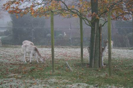 Er hangt een grijze waas over het hertenkamp, maar juist daardoor ontstaat er een speciaal effect. De herfstbladeren zorgen verder voor een sfeervol beeld.