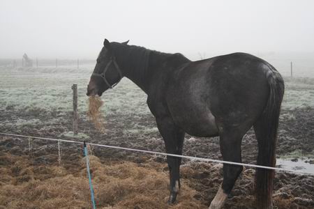 Een van de Zwamapaarden aan de Meidoornstraat, tegen een nevelige achtergrond. Prachtig ook dat plukje hooi....