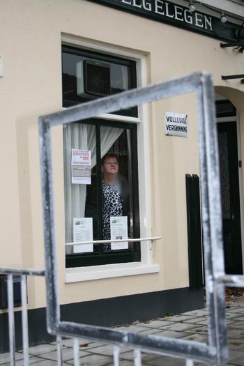 Niet iedereen kon de waterkou buiten even goed verdragen... Tieneke van der Veen houdt de boel in de gaten van achter het raam, benieuwd of de naam Welgelegen houdbaar blijkt...