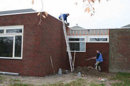 Twee Kooiwerkers doen een buitenklus: verzekering goede afvoer hemelwater