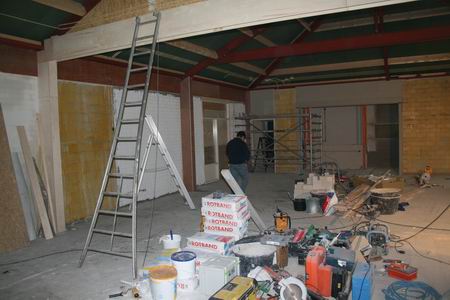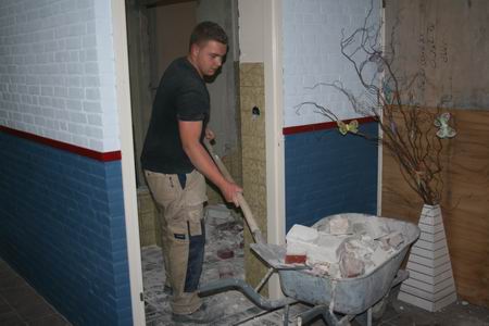 Binnen heerst er een aangename klussfeer. De benodigde materialen en hulpmiddelen staan en liggen strategisch opgesteld. De doeners weten precies wat ze nodig hebben, pure vakkundigheid. Dit wordt dus de nieuwe, grote zaal!