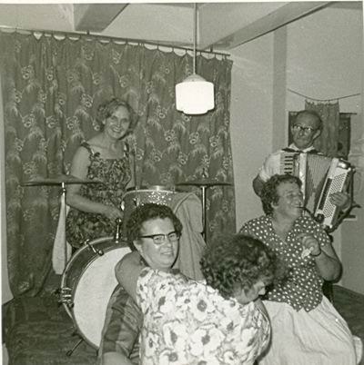 Foto van een kermismoment, jaren vijftig. Vooral de maandagavond was een hoogtepunt, met een vast muzikantenduo. Namen????