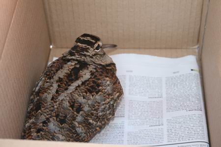 Bij de familie Thomassen is een vogel tegen het raam gevlogen (bedreigd door een roofvogel, of een kat?) Nee, geen grutto, het lijkt me een snip, versuft in de doos. Onbekend letsel...