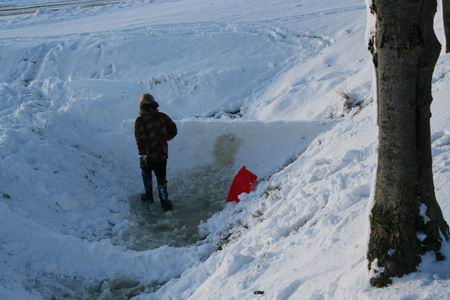 Aan de westkant van het dorp is een jeugdige kandidaat-waterbouwkundige proeven aan het nemen in de besneeuwde sloot nabij de keerlus. Eén alleen en toch gezellig...