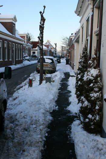 De Langestraat, het middengedeelte, zo maar een voorbeeld dat straatjes worden schoongeveegd (ook al lijkt de sneeuwschuiver op de rijbaan de overtollige sneeuw juist weer richting voetpad te schuiven...). Doet goed voorbeeld goed volgen?
