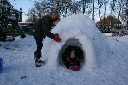 Dochter Pien en vader Pieter hebben samen met de overburen in de tuin een prachtige iglo gebouwd, onder architectuur. Vakantie-activiteit pur sang!