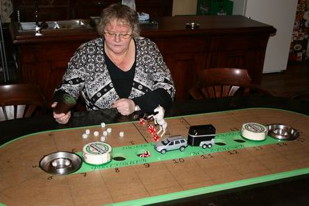 Tieneke in de gelagkamer met het paardenracespel, gemaakt en gespeeld door een groepje hechte vrienden van Welgelegen