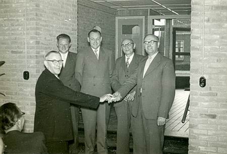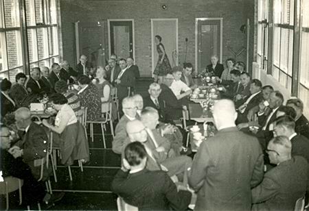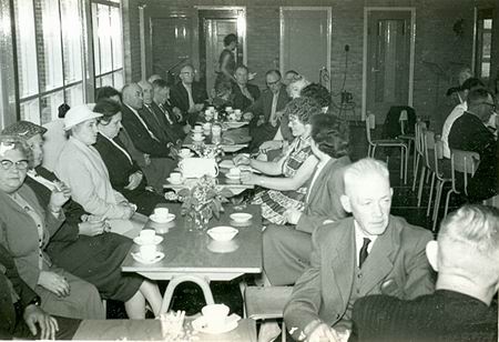 Een verduidelijkende, niet al te beste foto van de bijeenkomst in 1959 in de hal van de OLS aan de Oosterweg t.g.v. de opening van de speeltuin aan de zuidkant van de NH-kerk. Wie herkent er toenmalige aanwezigen???
