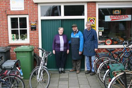 De drie steunpilaren van het Tweewielerhuis: Zus en broer Hanna en Klaas de Vries en medewerker Appie van Bergen