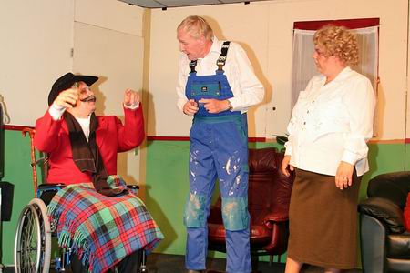 Een beeld uit het laatste door Marten Japenga geregisseerde toneelstuk "Knakworst", vorig jaar de eerste voorstelling in de nieuwe grote zaal van het dorpshuis. Links Mark Postema, midden Dirk Vos, rechts Margiet van der Molen