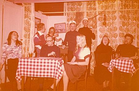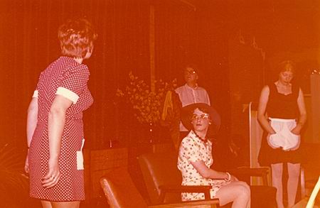 Een spelmoment uit het eerste toneelstuk onder regie van Marten Japenga: 1975 "Hartjes aan het spit". Vraag: welke vier speelsters staan hier , ietwat verkleurd, in beeld?