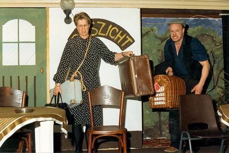 Een spelmoment uit 1990, toen het stuk "Niet elke haan kraait" werd opgevoerd. Links de helaas te vroeg overleden Wilma Korringa-Boer, rechts Wim Bos