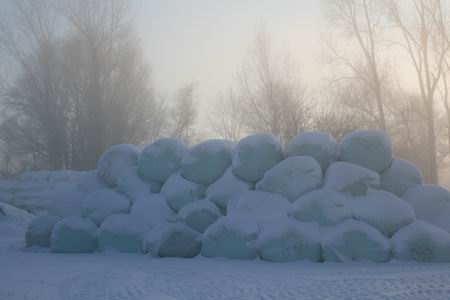 Bepoederde oliebollen? Fors uitgevallen sneeuwballen? Nee, het is het in plastic verpakte voergras van boer Datema...
