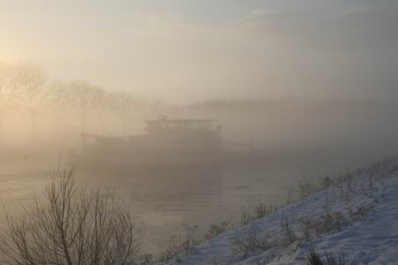 De "Linda" uit Drachten (ruim 2900 ton) vaart in de mist richting de sluis bij Gaarkeuken, ijs (nog?) gemakkelijk brekend. Vannacht verwacht: van min 5 tot min 15....