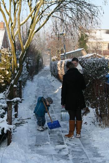 Klasse! De familie Medema vond het deze keer haar beurt het pad tussen de Verl.Oosterweg en de Nieuwstraat begaanbaar te maken. Ook zoontjelief, amper enkele turven hoog, hielp dapper mee!