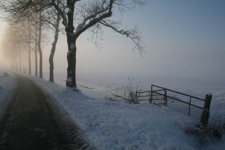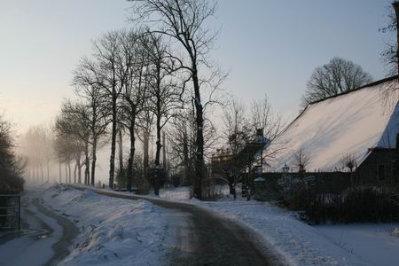 Grote verschillen in een betrekkelijk klein land, ook wat de weersomstandigheden betreft. Hier, in het noordwesten van de provincie Groningen, vanmorgen een langdurige sneeuwbui en vanmiddag prachtig zonnig weer, uitnodigend. Voor wandelaars tenminste, automobilisten zouden zich wat minder aangesproken moeten voelen en fietsers, nee, die waagden hun karretje niet aan de vraatzucht van de ruimschoots gestrooide pekel…. Zelf koos ik de route via de Oosterweg, NH-kerk, Langestraat, Schippersstraat naar Mokkenburg, en langs het Van Starkenborghkanaal weer terug naar het dorp, dat steeds nadrukkelijker in de mist kwam te liggen. Mooie beelden, maar, ik geef toe, het is maar net hoe je ze bekijkt… (Zaterdag trof ik iemand die eerlijk bekende al ‘strontflaauw te weden van dij snijprut…’)