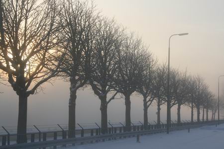 De kale kastanjes keurig in het gelid, nabij Koopman, langs het kanaal. Deze keer kregen ze de voorkeur boven de vrachtwagens op het terrein zelf