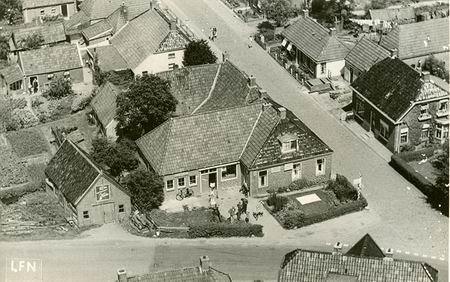 Centraal in beeld rijwielhandel S. de Vries, die zich in 1946 vestigde in het hoekpand en in 1956 de rijwielzaak uitbreidde. Voor ‘46 zat slagerij Ploeg op deze plek, sommige onderdelen in de werkplaats van het huidige Tweewielerhuis herinneren nog aan die slagersperiode! Waar moet je eerst naar kijken? Zoek de verschillen…. Zo’n luchtfoto, ik word er onrustig van…. De starende mensen op diverse plekken, de oprit van De Vries, de Noorderweg, achter in de tuin, hand boven de ogen: “Wat is dat daar in de lucht, laagvliegend? Wat doet dat toestel daar???!!” Foto’s maken, dat weten we nu! Hé, kijk eens, links staat de schuur van stelmaker Schuitema. Er liggen nog boomstammen te wachten op een zaagbeurt. Veel activiteit lijkt er niet (meer) te zijn, Schuitema’s bedrijf al op een laag pitje? En warempel, Sijtse de Vries staat zelf ook bij de mensen op zijn erf, omhoog kijkend. Wat voor borden zitten er eigenlijk op de muren? Een laken ligt keurig te drogen op de ‘bleek’, het gazon zeggen we tegenwoordig. (‘Blaike” zeiden we in Oost-Groningen…) De verkeerssituatie anders dan nu. De fraaie ANWB-wegwijzer keurig in het hoekje van de tuin, nog geen grote loofboom te zien! Wat een licht! Verbazingwekkend dat er noch op de Langestraat, noch op de Noorderweg iets valt waar te nemen van rijdend verkeer: geen fietser, geen auto, geen voortrazende tractoren, alleen maar enkele gezond-nieuwsgierige Noordhorners… Rechts Wiboldy met bedrijfsruimte, het bijbehorend huisje waar Harma-van-de-bibliotheek woont, werd toen wellicht nog door twee gezinnen benut. Dat gold voor vele huizen aan de Noorderweg, de Nieuwstraat, zelfs aan de Langestraat. Verder naar het noorden wordt het wazig, al hangt de waslijn vol. Inrit naar kwekerij Hummel? Noordhorn veranderde, verandert steeds maar weer, óók in de jaren vijftig! (JB)