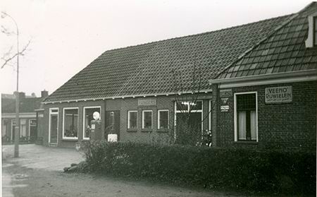 Het pand van Rijwielhandel De Vries na de verbouwing in 1956. De stelmakerij van Schuitema is verdwenen, het pand van de Vries is verlengd en er is een fietsenserre, een showroom aangebouwd