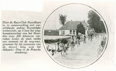 Noordhorn heeft wat de wielersport betreft “grote zonen” voortgebracht. Een van hen is Hendrik Renkema geweest, straks meer over hem. Die wielersuccessen werden met name behaald voor de Tweede Wereldoorlog, in eind twintiger en een groot deel van de dertiger jaren. Een bekende op de racefiets is Joh.Lodewegen geweest, geboren en getogen in Noordhorn, maar later actief als badmeester in Drenthe, maar ook in Oldehove, in “Elektra”. Van Lodewegen en zijn maats zijn foto’s bewaard gebleven. Twee ervan staan in het boek “Gisteren voor de lens”, bladzijde 142 en 143 (Uitg. Profiel, Bedum, november 1983, ISBN 9070287137; niet meer leverbaar, wel 2ehands). Joh.Lodewegen is kampioen van het Noorden geweest, zowel individueel als samen met zijn ploeggenoten van de ‘Raceclub Noordhorn’. Hendrik Renkema moet minstens zo getalenteerd zijn geweest, maar over hem is minder bekend, ook bij mij. Inmiddels is dat veranderd door een mail van William van Peer uit het Brabantse Sint Willibrord. William (33 jaar) is een fervent supporter van de wilersport. Zijn grootvader was de roemruchte Wim van Est (overleden in 2003), die niet alleen aansprekende prestaties leverde in de Tour de France, maar daar ooit ook een legendarische val meemaakte in het gebergte (…en zijn Pontiac-horloge liep nog…). William van Peer heeft een grote hobby: het verzamelen van foto’s/reproducties met of zonder handtekening van beroepswielrenners, maar ook bidprentjes en andere wielermemorabilia. William is al langere tijd op zoek naar een foto van Hendrik Renkema, oud-wielrenner en inwoner van Noordhorn. Hendrik Renkema heeft in de jaren dertig ook veel op de baan gefietst, met name in Leeuwarden (o.a. samen met zijn koppelgenoot Jan Bisschop uit Groningen). Renkema en Bisschop reden toen voor het West-Brabantse fietsenmerk ‘De Mol’ uit Ossendrecht. Grote Nederlandse wielrenners uit die jaren, zoals Cees Bogaert, Marinus Valentijn en Thijs van Oers, reden ook voor dit merk. “Het zegt genoeg over de kwaliteit van Hendrik Renkema dat hij onder contract stond bij dit team”.