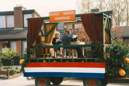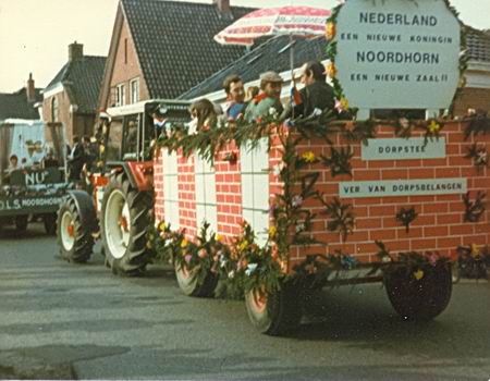 Een versierde wagen uit de feestelijke optocht van 5 mei 1980. De nieuwe Koningin? Beatrix! De nieuwe zaal van Dorpsbelangen? In 2009 eindelijk werkelijkheid geworden!