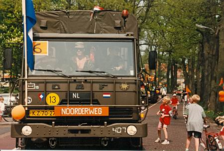 Een eerste prijs voor de geüniformeerde jeugd van Noordhorn in een legervoertuig tijdens de feestelijke optocht op 5 mei 1995