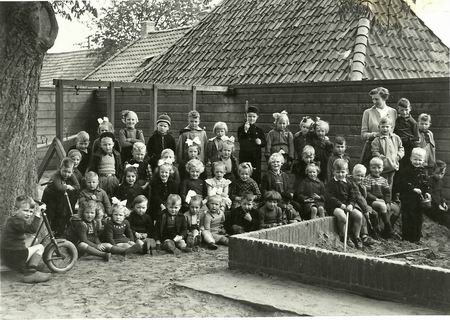Brengt ons desondanks bij de grote reünie op zaterdag 12 juni a.s. Van Fokje Rosema kreeg ik de volgende foto toegestuurd, uit 1955. Afgebeeld de toenmalige Nutskleuterschare, op het terrein bij de Nutskleuterschool aan de Achterweg, onder de kastanjeboom, mét juf Sinie de Jong (die óók op de reünie komt, op 12 juni!). Een iets vroegere foto dus dan de foto die nog niet zo lang geleden werd gepubliceerd in het Dagblad van het Noorden in de rubriek “Ik zoek….” Ook van déze foto willen we vanzelfsprekend graag weten WIE er op de foto staan! (Reacties naar het bekende adres: jan_b@hetnet.nl). Ook laten we een foto zien die Fokje stuurde, waarop zijzelf staat geportretteerd samen met juf Sinie de Jong, in 1994, bij een toevallige ontmoeting in Garnwerd (café Hamming).