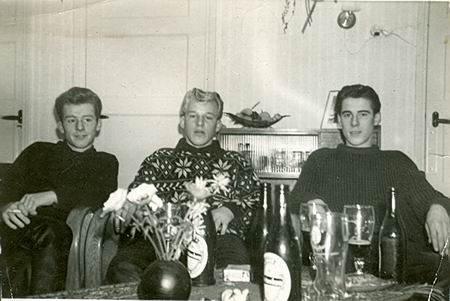 Jos als 'grote(re) jongen', tussen twee vrienden (Onno Duisterwinkel en Piet Bijleveld), ontspannen de fotograaf in de lens kijkend