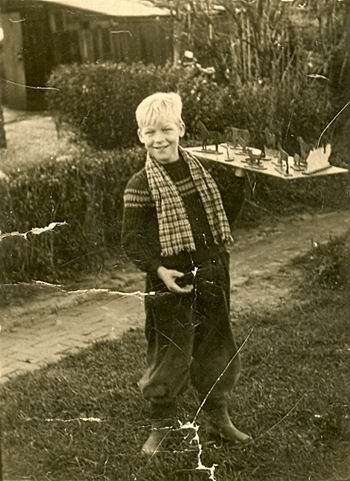 Een jongere Jos trots poserend met een handvaardigheidswerkstuk op het Torenpad naast het huis van Wobbe Jonkman