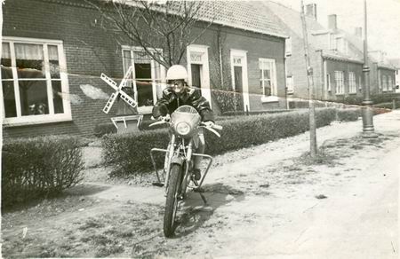 Jos, immer druk doende, hier op de brommer (of was het een motor?) aan de noordkant van de Verlengde Oosterweg. Correctie: Niet Jos zelf, maar 'kleine zus' Lena.... Lena was de jongste thuis, mocht altijd meer dan de anderen..... (zegt Jos...met een lach)