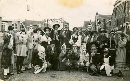 Het aanmeldingssecretariaat van de reünie (12 juni) kreeg van oud-Noordhorner Jos Koop (nu woonachtig in Kommerzijl, als ik het goed heb…) een aantal unieke foto’s. Kwalitatief valt er wel iets op aan te merken, ze hebben geléden….., maar wel kenmerkende tijdsdocumenten. Jos groeide op in het gezin Koop, eerst wonend aan de Verl.Oosterweg, later aan de Touwslagersbaan. Jos is een broer van de helaas in 1988 overleden Bouke (die we ook tegenkwamen in de toneelgroep van 1976 en op de foto bij de schuur van Sip van der Veen) en van zijn jongste zus Lena (over haar later meer). De meest opvallende foto betreft een groepsopname tijdens het schoolfeest in 1956. Aan de Oosterweg, voor de nieuwe lagere school (in februari 1956 in gebruik genomen, het feest was trouwens in augustus 1956), werd het een bonte verzameling van uiteenlopende mensen. Een aantal goed herkenbaar (zoals Gaatske Jager en Adam de Boer, de zussen Verhoef), een aantal vermomd, gemaskerd. Wie het zijn? Als iemand het weet, kom met namen a.u.b.! Vader en moeder Koop moeten ook op deze foto staan, evenals Jos, ‘ergens vooraan…’